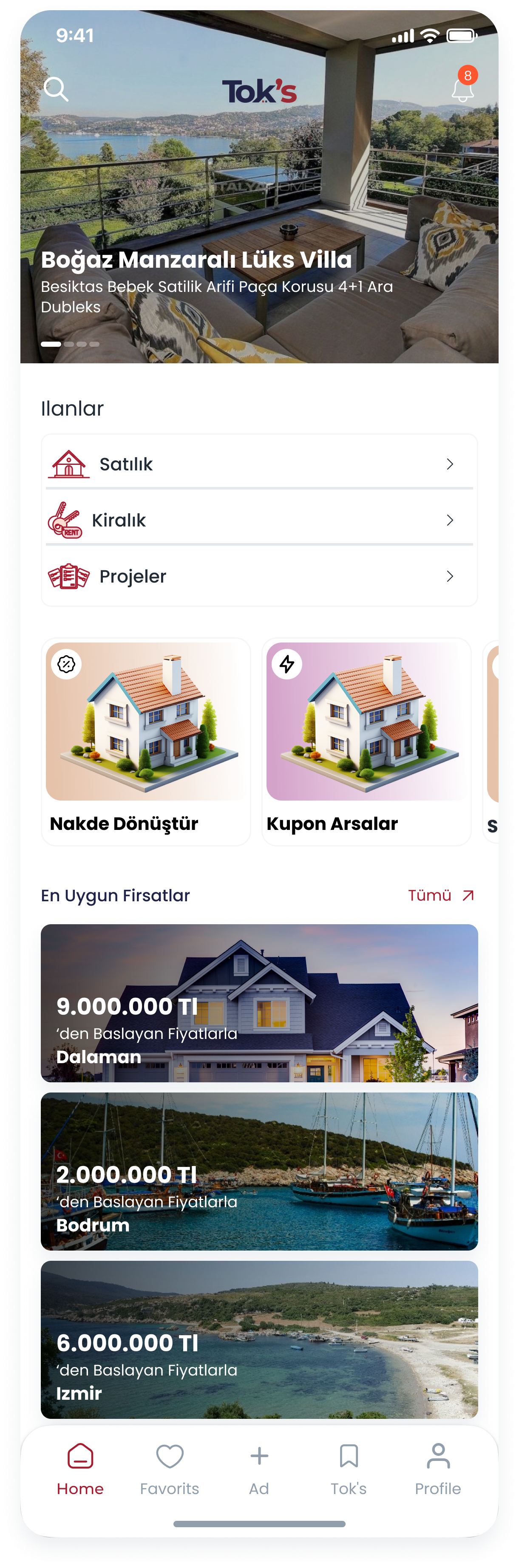 Tok's uygulamasının ana sayfası, emlakla ilgili tüm ihtiyaçlarınıza kolay erişim sağlar. İlanlarınızı inceleyebilir, en yeni fırsatları keşfedebilir, danışmanlarınızla iletişim kurabilir ve daha birçok işlemi ana sayfa üzerinden hızla gerçekleştirebilirsiniz. Uygulamanın ana ekranı, tüm özelliklere erişimi tek bir yerden sunar.