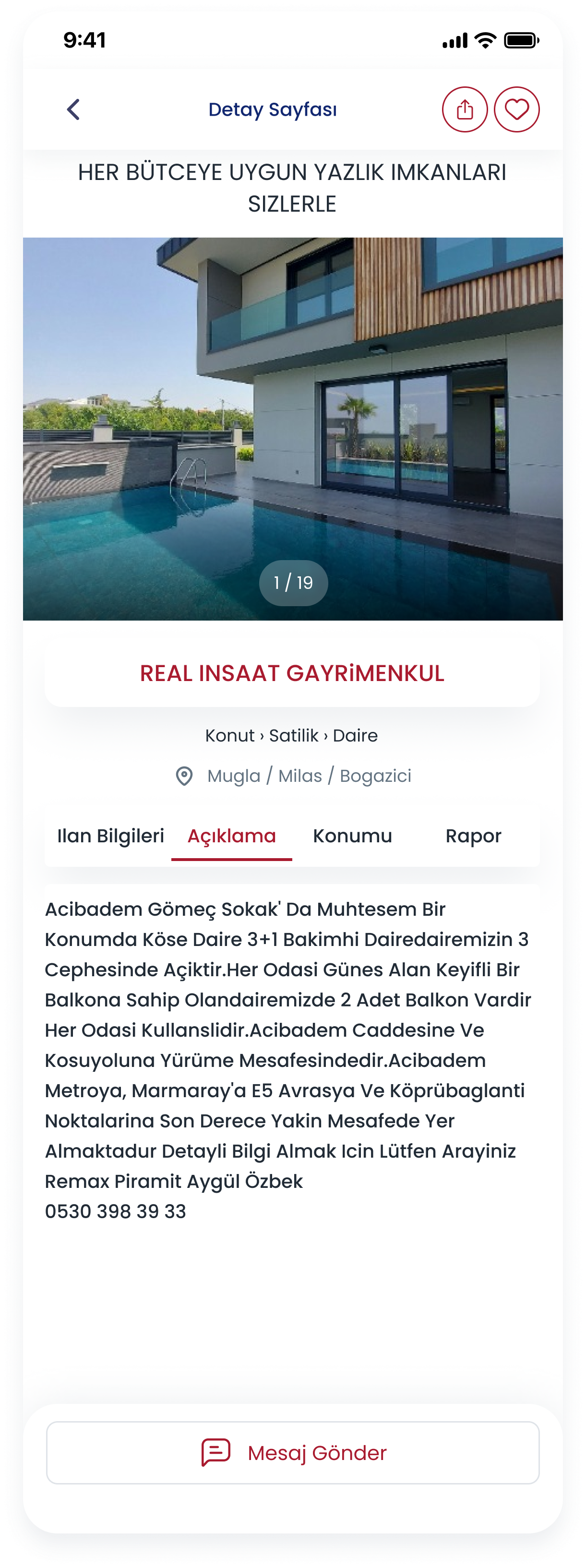 Satın almayı düşündüğünüz ilanların tüm detaylarına kolayca ulaşabilirsiniz. İlanın konumundan fiyatına, büyüklüğünden özelliklerine kadar tüm bilgilere hızlıca erişerek karar verme sürecinizi hızlandırabilirsiniz. Her bir ilan, kullanıcı dostu bir şekilde detaylandırılmıştır.